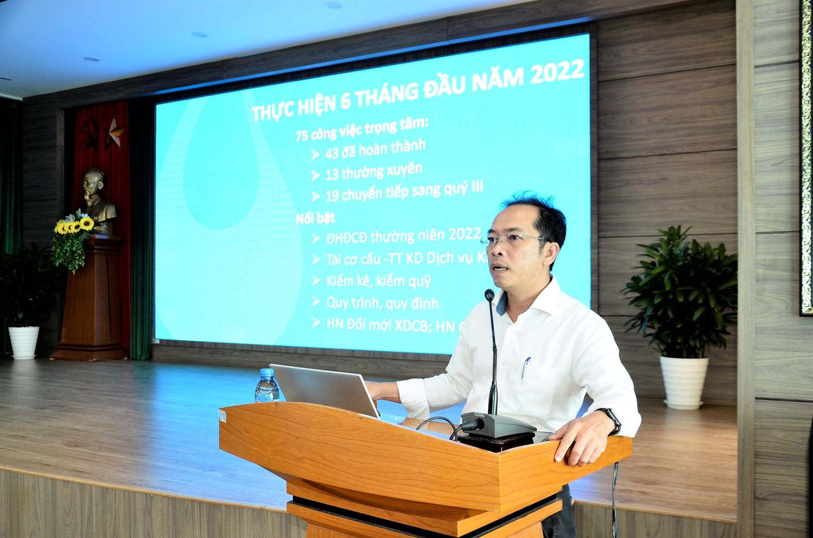Tại hội nghị, Ban Tổng giám đốc đã báo cáo sơ kết hoạt động 6 tháng đầu năm của các Khối: Sản xuất nước, Phụ trợ sản xuất nước, Xây dựng cơ bản-Dự án, Hành chính và công tác khác.