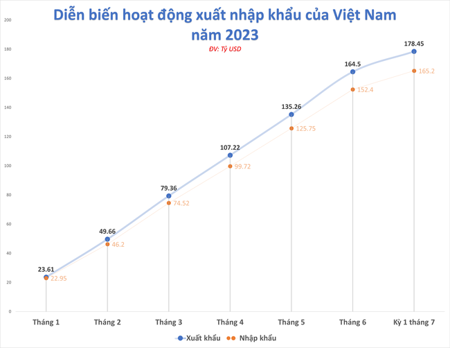Lũy kế từ đầu năm đến giữa tháng 7, kim ngạch xuất nhập khẩu hàng hóa của cả nước đạt 343,65 tỷ USD, giảm gần 15% so với cùng kỳ năm ngoái. Trong đó, xuất khẩu đạt 178,45 tỷ USD, giảm 11,4% (22,95 tỷ USD); nhập khẩu đạt 165,20 giảm 18,4% (hơn 37 tỷ USD).