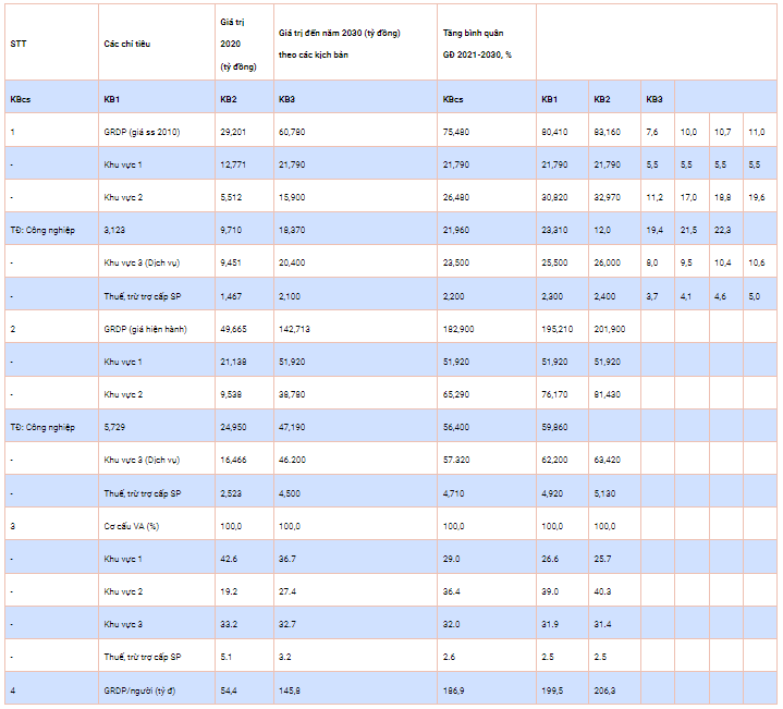 Bảng: Các kịch bản tăng trưởng tỉnh Bạc Liêu thời kỳ 2021-2030