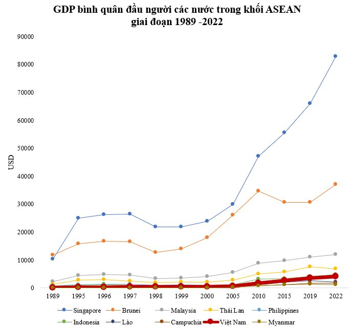 GDP bình quân đầu người các nước trong khối ASEAN giai đoạn 1989 -2022. Nguồn: Ngân hàng Thế giới.