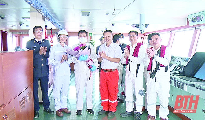 Lãnh đạo Chi cục Hải quan cửa khẩu Cảng Nghi Sơn chúc mừng đội ngũ cán bộ kỹ thuật của Nhà máy Lọc hóa dầu Nghi Sơn, PTSC Thanh Hóa hỗ trợ lai dắt chuyến tàu Viễn Thụy Dương cập phao rót dầu không bến thuộc Nhà máy Lọc hóa dầu Nghi Sơn thành công (tháng 3-2023).