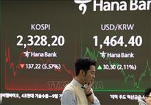 Bảng điện tử hiển thị chỉ số chứng khoán KOSPI tại ngân hàng Hana ở Seoul, Hàn Quốc. Ảnh tư liệu: THX/TTXVN