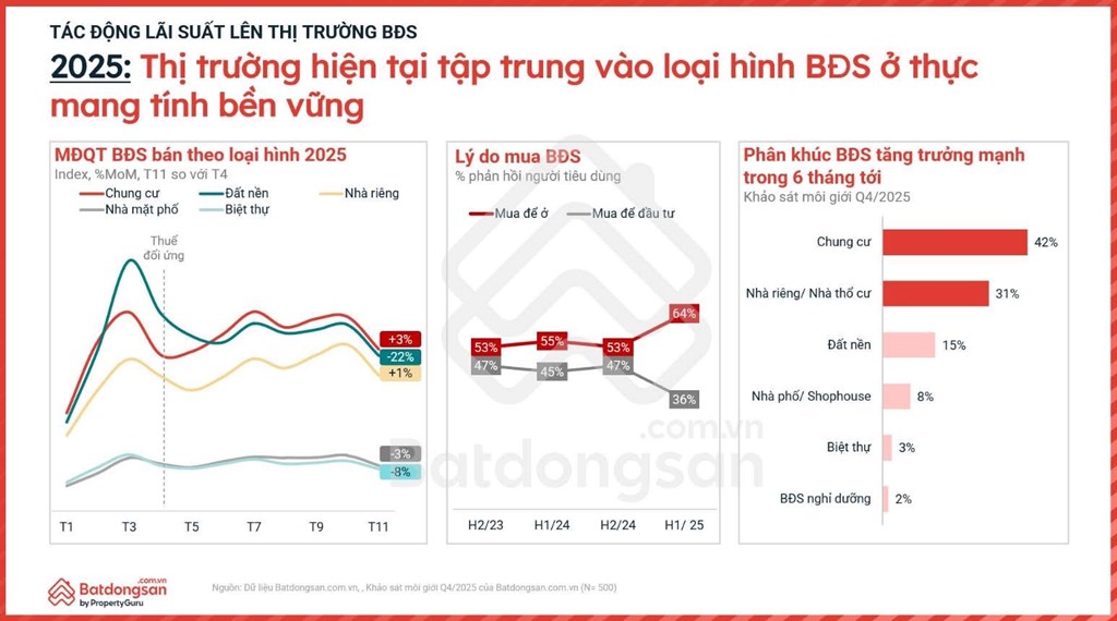 Theo phân tích của chuyên gia này, lãi suất thấp giúp khơi thông nhu cầu ở thực – lực kéo quan trọng nhất thị trường hiện nay. Trong bối cảnh thu nhập tăng chậm và giá nhà leo thang mạnh, lãi suất thấp trở thành “van hỗ trợ” để người dân có thể tiếp cận tín dụng. Khi lãi suất giảm, áp lực tài chính giảm theo, giúp người mua ở thực mạnh dạn hơn trong quyết định xuống tiền. Điều này lý giải giai đoạn 2024–2025, ngay khi lãi suất hạ về mặt bằng hợp lý, thị trường căn hộ lập tức phục hồi cả về nhu cầu và lượng giao dịch.