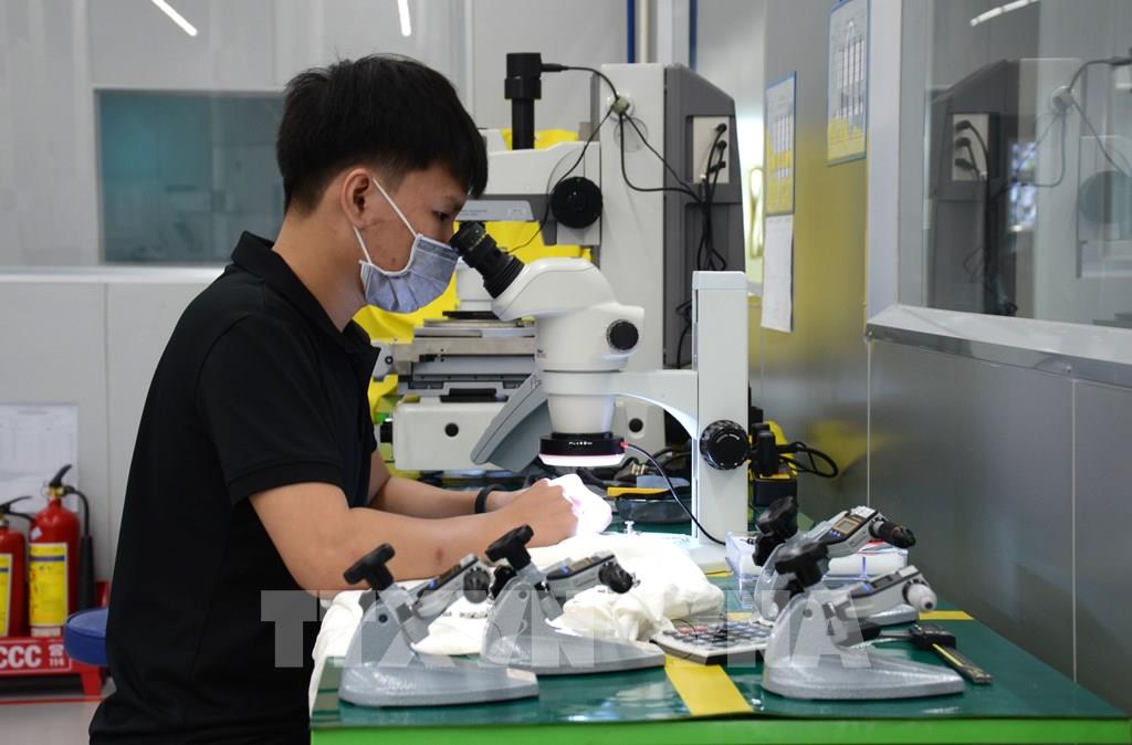 Khâu kiểm tra sản phẩm trước khi xuất xưởng tại công ty ICT Vina (100% vốn Hàn Quốc). Ảnh tư liệu: Quốc Dũng - TTXVN
