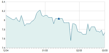 | 28/03/2022 | -0,70 / -2,21% | 31,80 | 31,90 | 30,20 | 31,00 | 31,00 | 17,58 | 283.200 |   |