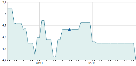 | 23/06/2023 | -0,40 / -3,42% | 11,20 | 11,30 | 11,20 | 11,30 | 11,29 | 7,82 | 700 |   |