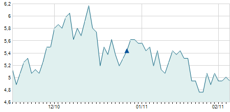 | 02/12/2022 | -0,59 / -5,90% | 10,65 | 10,65 | 9,41 | 9,41 | 10,03 | 6,51 | 200 |   |