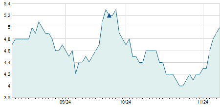 | 17/09/2024 | +0,55 / +4,31% | 13,00 | 13,50 | 13,00 | 13,30 | 13,07 | 10,43 | 13.400 |   |