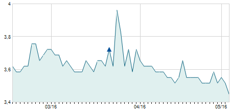 | 06/09/2023 | -0,20 / -1,38% | 14,45 | 14,45 | 14,25 | 14,25 | 14,29 | 9,86 | 1.300 |   |