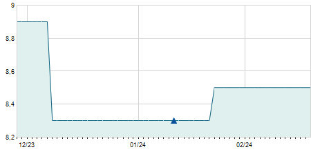 | 08/03/2022 | -0,30 / -2,07% | 14,50 | 14,50 | 14,20 | 14,20 | 14,30 | 14,20 | 8.200 |   |