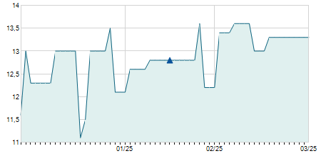 | 26/04/2022 | +0,50 / +4,00% | 12,50 | 13,00 | 12,50 | 13,00 | 12,70 | 13,00 | 800 |   |