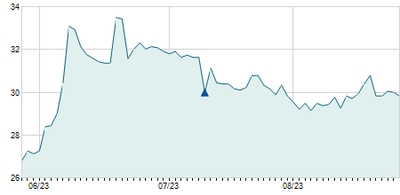 | 13/06/2023 | +1,40 / +4,91% | 29,00 | 30,00 | 29,00 | 29,90 | 29,70 | 23,73 | 6.600 |   |