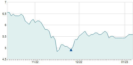 | 31/03/2023 | +1,10 / +14,67% | 8,60 | 8,60 | 8,60 | 8,60 | 8,60 | 8,60 | 100 |   |