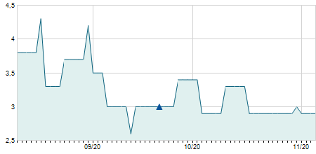 | 06/03/2020 | -0,10 / -25,00% | 0,30 | 0,30 | 0,30 | 0,30 | 0,30 | 0,30 | 8.100 |   |