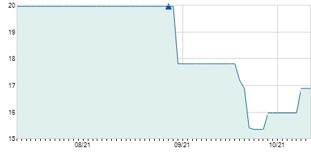 | 19/07/2021 | -2,00 / -6,25% | 30,00 | 30,00 | 30,00 | 30,00 | 30,00 | 25,05 | 5.100 |   |