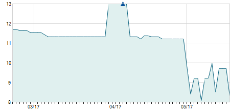 | 08/10/2021 | -0,30 / -2,46% | 12,20 | 12,20 | 10,50 | 11,90 | 11,40 | 10,21 | 9.400 |   |
