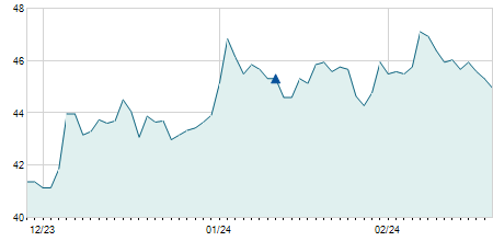 | 23/02/2017 | -0,50 / -0,62% | 82,00 | 82,00 | 79,60 | 80,50 | 80,38 | 58,62 | 83.220 |   |
