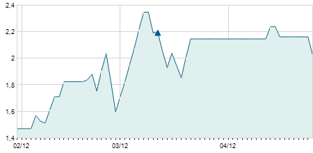 | 09/05/2014 | +1,50 / +2,73% | 57,00 | 57,00 | 53,50 | 56,50 | 56,50 | 17,00 | 190 |   |