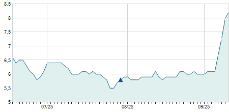 | 08/08/2022 | -0,10 / -0,55% | 18,50 | 18,80 | 18,00 | 18,20 | 18,30 | 13,88 | 187.500 |   |
