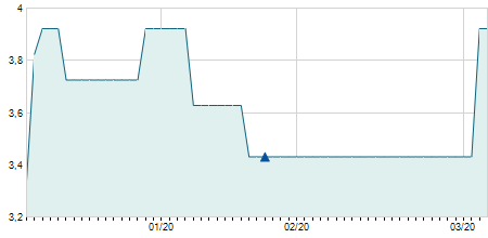 | 03/08/2022 | +0,10 / +3,45% | 3,00 | 3,00 | 2,90 | 3,00 | 2,90 | 3,00 | 526.300 |   |