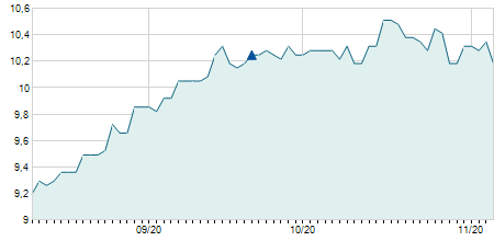 | 20/10/2022 | -0,10 / -4,35% | 2,30 | 2,30 | 2,20 | 2,20 | 2,20 | 2,20 | 102.400 |   |