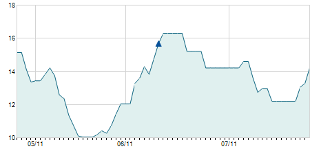 | 11/10/2010 | -0,10 / -0,84% | 11,70 | 12,00 | 11,70 | 11,80 | 11,80 | 7,79 | 21.650 |   |