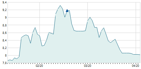 | 04/08/2008 | -0,40 / -2,70% | 15,70 | 15,70 | 14,30 | 14,40 | 14,40 | 7,20 | 12.000 |   |