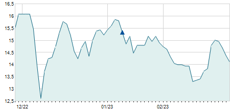 | 01/06/2009 | +0,40 / +2,78% | 15,00 | 15,00 | 14,50 | 14,80 | 14,80 | 8,02 | 2.700 |   |