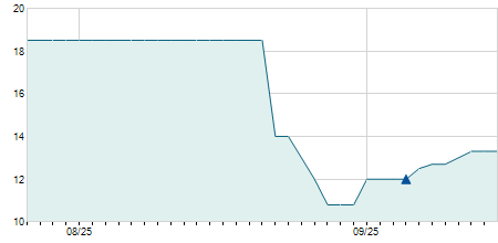 | 23/07/2020 | -0,10 / -7,14% | 1,30 | 1,30 | 1,30 | 1,30 | 1,30 | 1,30 | 11.600 |   |