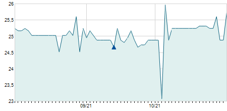 | 26/10/2020 | 0,00 / 0,00% | 1,20 | 1,30 | 1,20 | 1,30 | 1,24 | 1,30 | 24.200 |   |