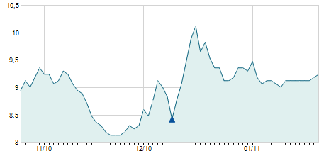 | 12/08/2020 | -0,10 / -0,90% | 11,10 | 11,10 | 10,90 | 11,00 | 10,97 | 9,11 | 156.300 |   |