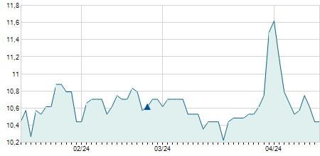 | 11/07/2023 | -0,10 / -0,93% | 10,80 | 10,80 | 10,70 | 10,70 | 10,77 | 9,31 | 37.700 |   |