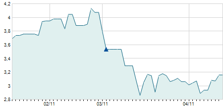 | 03/10/2024 | -0,30 / -1,05% | 28,60 | 28,60 | 28,30 | 28,30 | 28,60 | 26,06 | 1.200 |   |
