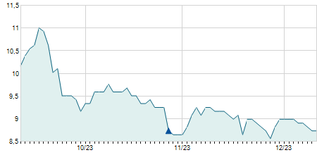 | 11/04/2016 | -0,50 / -8,33% | 5,90 | 5,90 | 5,50 | 5,50 | 5,73 | 2,61 | 300 |   |