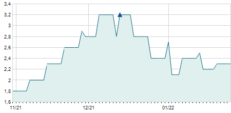 | 22/01/2024 | -0,20 / -1,94% | 10,20 | 10,20 | 10,00 | 10,10 | 10,08 | 10,10 | 39.900 |   |