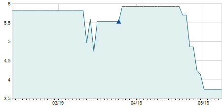 | 19/06/2018 | -0,25 / -6,79% | 3,45 | 3,73 | 3,43 | 3,43 | 3,45 | 3,43 | 104.780 |   |