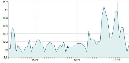 | 11/08/2009 | +2,80 / +6,90% | 43,40 | 43,40 | 40,70 | 43,40 | 43,40 | 12,31 | 1.021.600 |   |