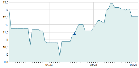 | 10/01/2019 | -0,06 / -1,96% | 3,10 | 3,10 | 2,98 | 3,00 | 3,00 | 3,00 | 84.300 |   |