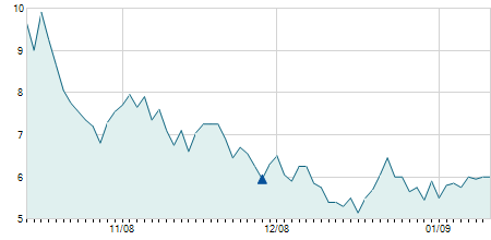 | 22/06/2011 | -1,20 / -13,95% | 7,60 | 8,10 | 7,40 | 7,40 | 7,40 | 3,91 | 8.300 |   |