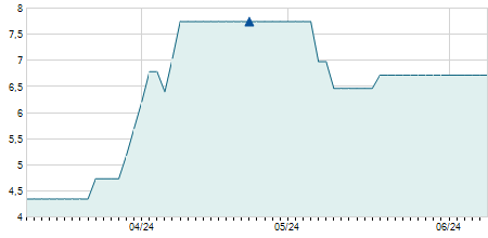 | 25/03/2014 | +0,30 / +4,55% | 6,60 | 7,20 | 6,60 | 6,90 | 6,90 | 5,31 | 2.800 |   |