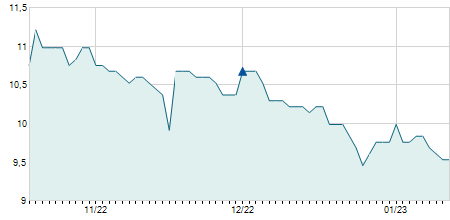 | 04/04/2014 | -0,10 / -1,28% | 7,80 | 8,00 | 7,60 | 7,70 | 7,70 | 3,16 | 1.253.660 |   |