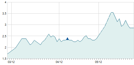 | 14/05/2021 | +0,50 / +14,29% | 3,40 | 4,00 | 3,20 | 4,00 | 3,95 | 4,00 | 2.752.200 |   |