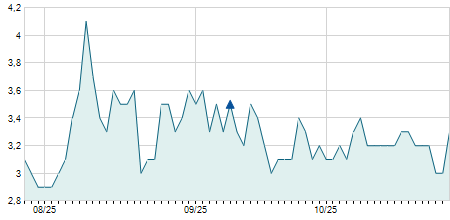 | 07/02/2023 | +0,30 / +3,09% | 10,20 | 10,90 | 9,70 | 10,00 | 10,50 | 8,16 | 11.700 |   |