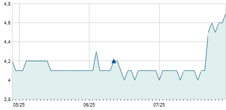 | 15/01/2024 | -3,00 / -9,09% | 33,00 | 33,00 | 30,00 | 30,00 | 32,25 | 30,00 | 400 |   |