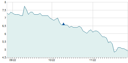 | 26/11/2020 | -0,60 / -7,89% | 7,00 | 7,00 | 6,90 | 7,00 | 6,98 | 5,20 | 500 |   |