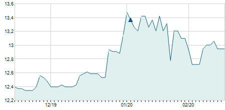 | 10/04/2023 | +1,60 / +12,70% | 14,40 | 14,40 | 14,20 | 14,20 | 14,20 | 11,59 | 1.000 |   |