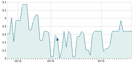 | 10/11/2020 | -0,10 / -1,15% | 8,80 | 8,80 | 8,60 | 8,60 | 8,70 | 6,88 | 2.680.300 |   |