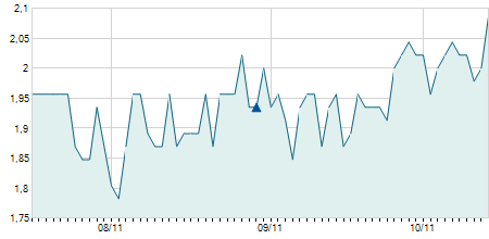 | 11/02/2020 | 0,00 / 0,00% | 8,80 | 9,10 | 8,80 | 9,00 | 8,91 | 7,20 | 1.989.200 |   |