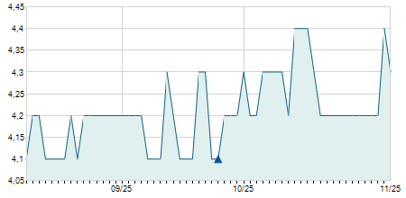 | 11/03/2024 | 0,00 / 0,00% | 4,20 | 4,30 | 4,10 | 4,20 | 4,20 | 4,20 | 96.000 |   |