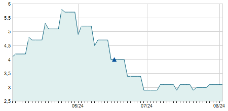 | 02/08/2021 | +0,10 / +2,27% | 4,40 | 4,50 | 4,20 | 4,50 | 4,40 | 4,50 | 27.300 |   |